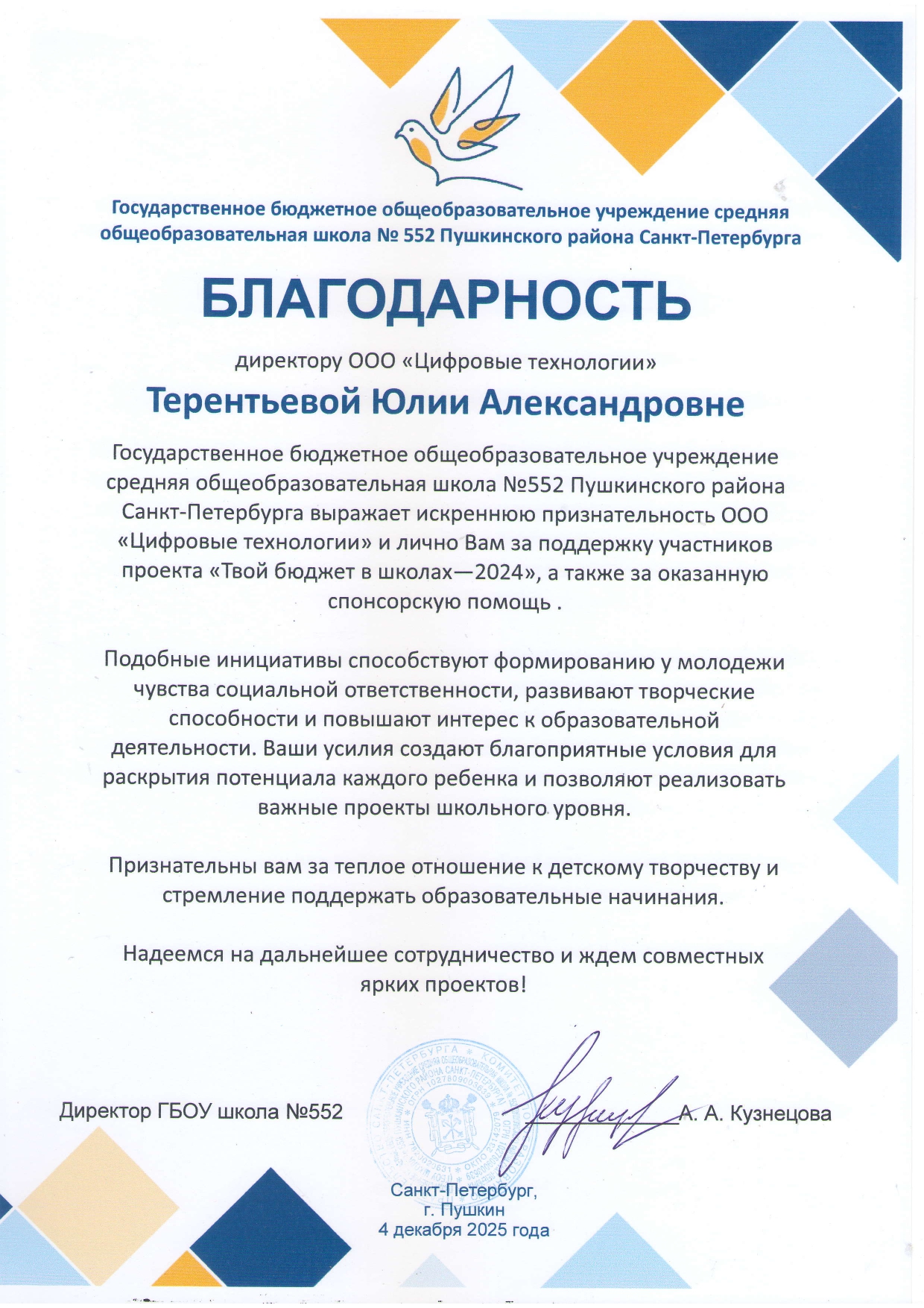 Государственное бюджетное общеобразовательное учреждение средняя общеобразовательная школа №552 Пушкинского района Санкт-Петербурга выражает искреннюю признательность ООО «Цифровые технологии» и лично Вам за поддержку участников проекта «Твой бюджет в школах - 2024», а также за оказанную спонсорскую помощь.